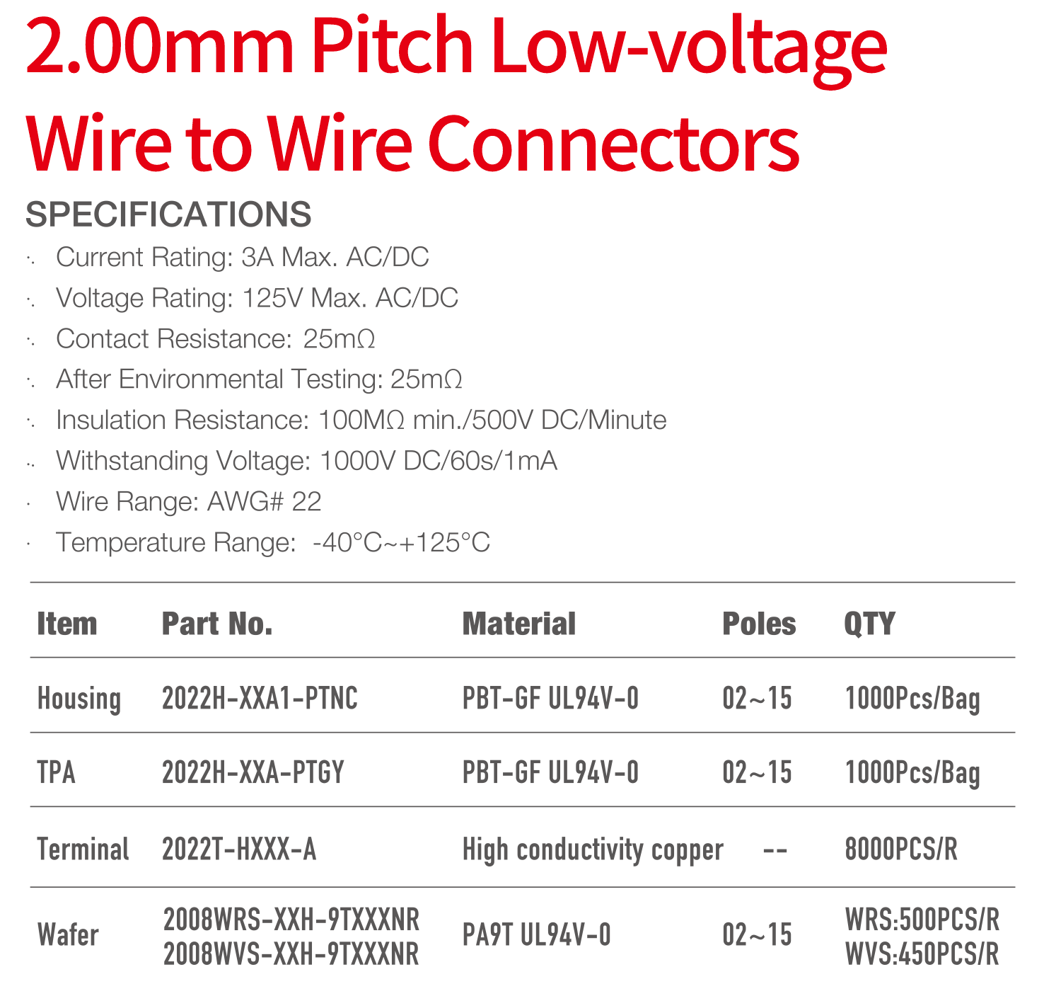 2022A1 Series 2.00mm Pitch (.079") Low-voltage Wire to Wire Connectors